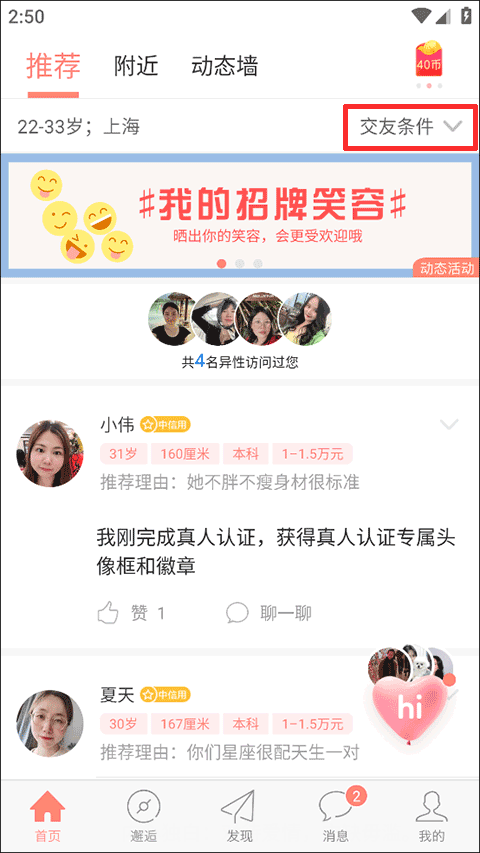 该功能旨在帮助性格内向的用户主动开启缘分。点击首页右下角“HI”或在福利中心完成“打招呼”任务后,系统将根据您的资料和匹配规则,自动向潜在匹配对象发送您的招呼,助力建立初步联系。
