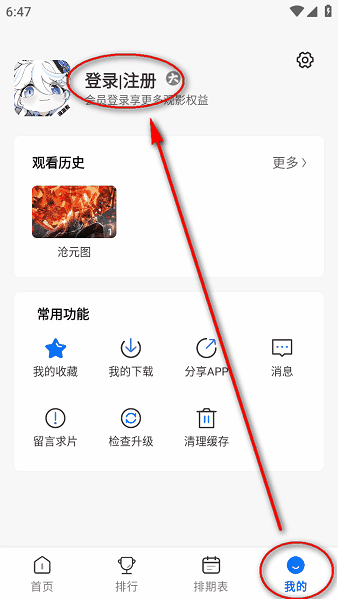 打开动漫国后,点击右下角“我的”,再点击左上角的登录|注册;
