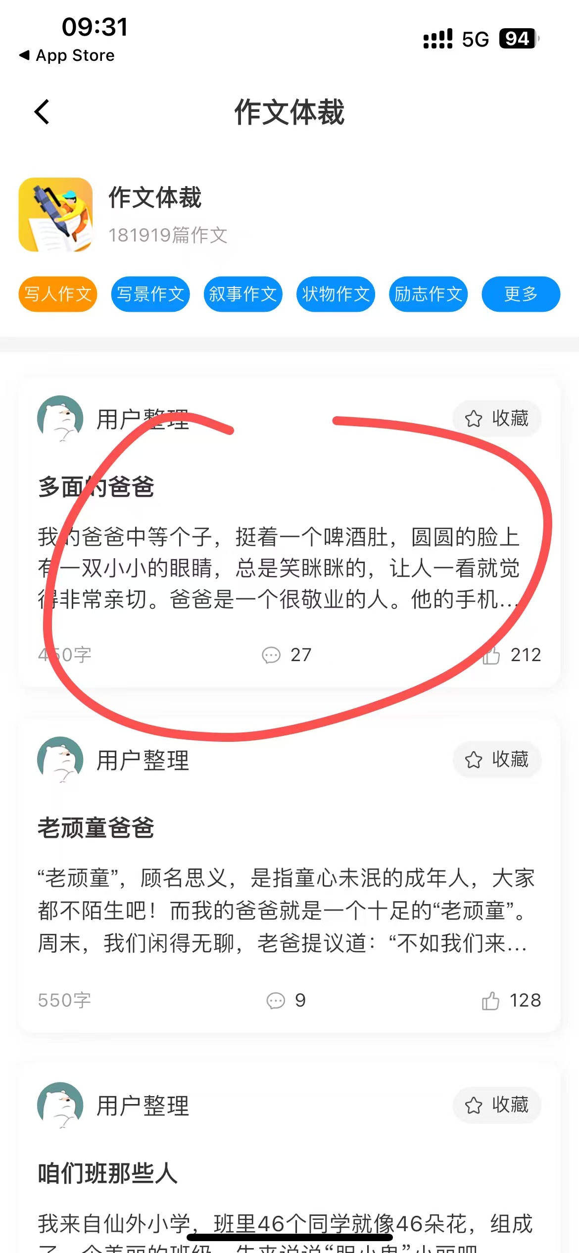 3、来到这个界面,我们可以选择喜欢的分类,然后点击您想学习的作文,查阅即可学习优秀作文。