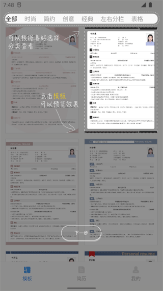 任意模板您都可以进行排版调整,一键生成简洁大方的个人简历。