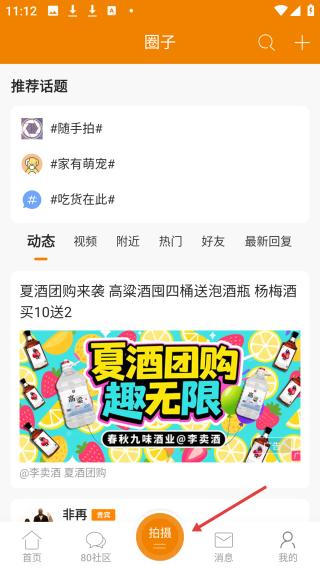 3、点击圈子界面呈现推荐话题,分动态、视频等类别,夏酒团购广告醒目,底部有拍摄分享按钮。