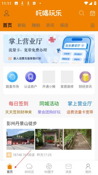 1、点击首页以橙色为主色调,设新帖、随拍等栏目,有营业办理优惠,展示同城活动资讯。
