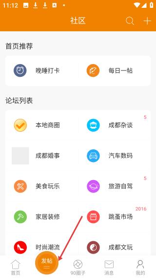 2、点击社区页面含首页推荐与论坛列表,覆盖本地商圈、美食玩乐等板块,方便用户随时发帖互动。