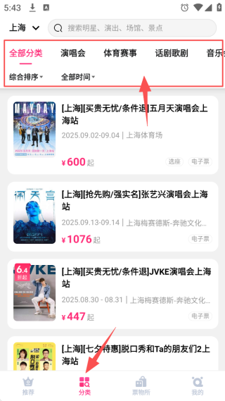 2、在“分类”栏目中,可以根据演唱会、体育赛事、话剧歌剧等类别进行演出的挑选进行购票。