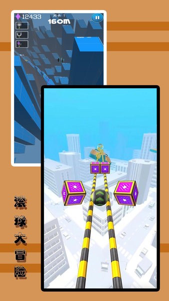 沿着大坡道滚动,注意赛道会突然断开哦,超多精彩的趣味。