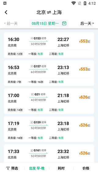 3、选择完成后,大家输入目的地与现居地进行查询,根据自己的时间安排选择合适的班次。