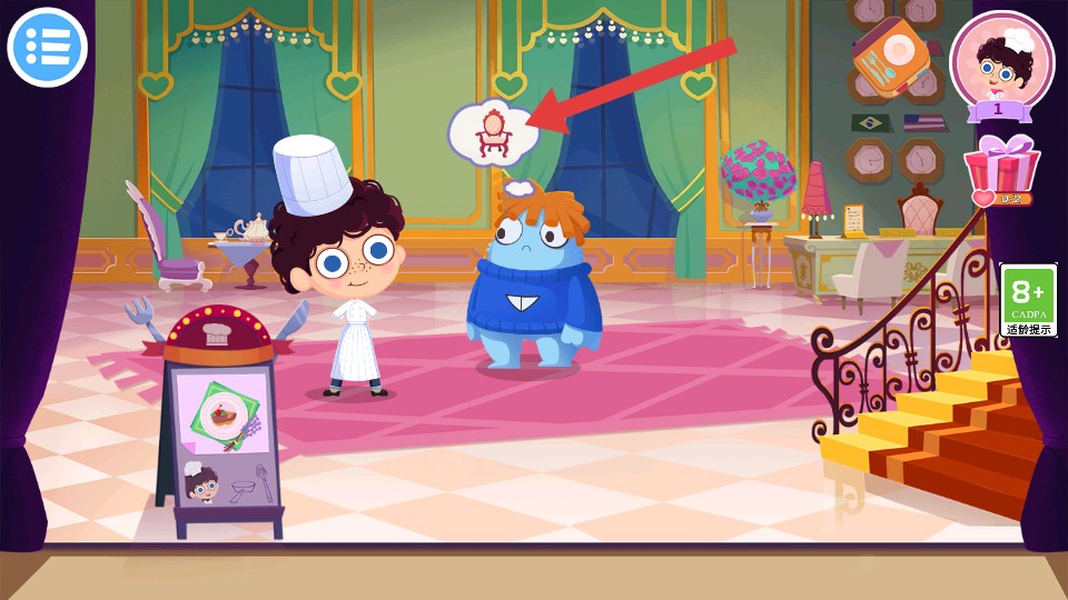 1、进入游戏场景,留意蓝色小人头上【红箭头】所指【椅子】的气泡提示,引导顾客入座。