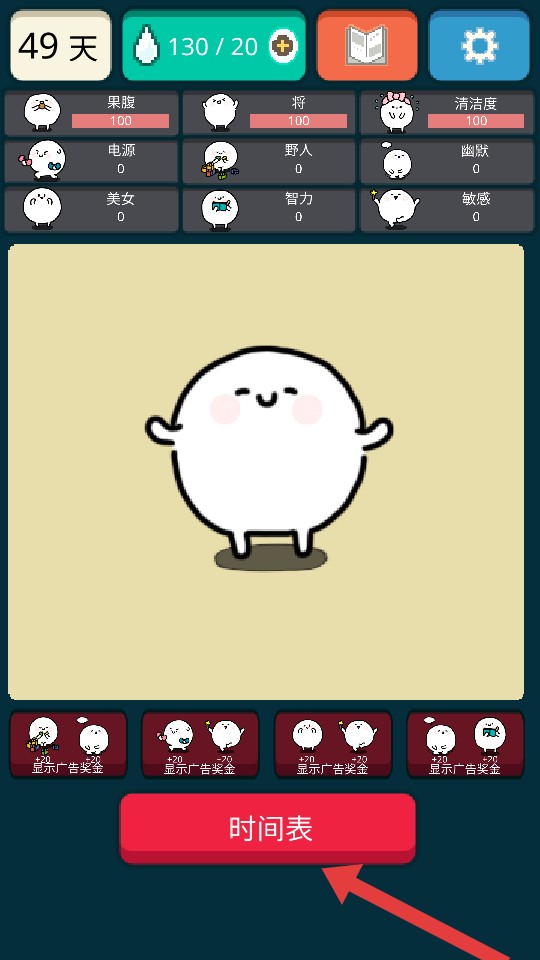1、进入游戏界面,查看【49天】及各项数值状态后,点击【红箭头】指向的【时间表】按钮。