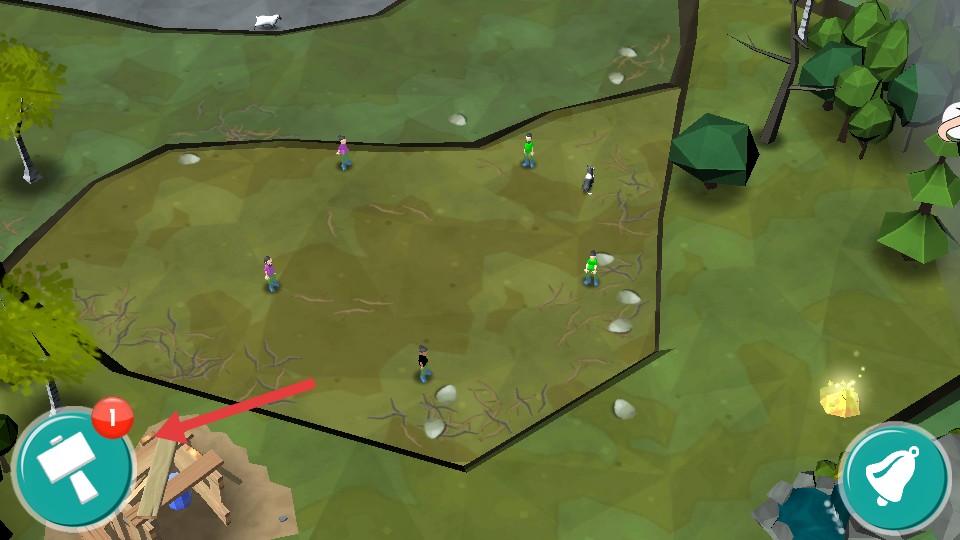 3、在场景中查看角色分布,点击左下角带红色提示的建筑类按钮,准备进行营地建筑布置。