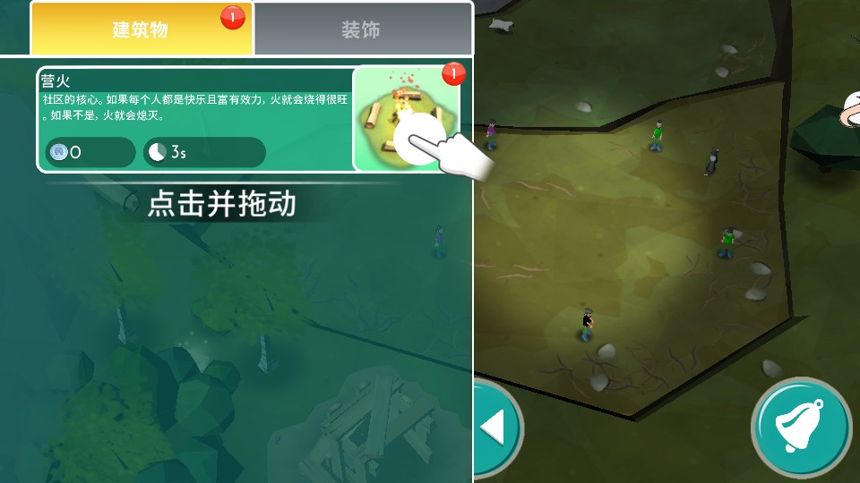 4、在【建筑物】标签中,找到【营火】选项,按照【点击并拖动】的提示,将营火放置到合适位置,它是社区核心,影响营地状态。