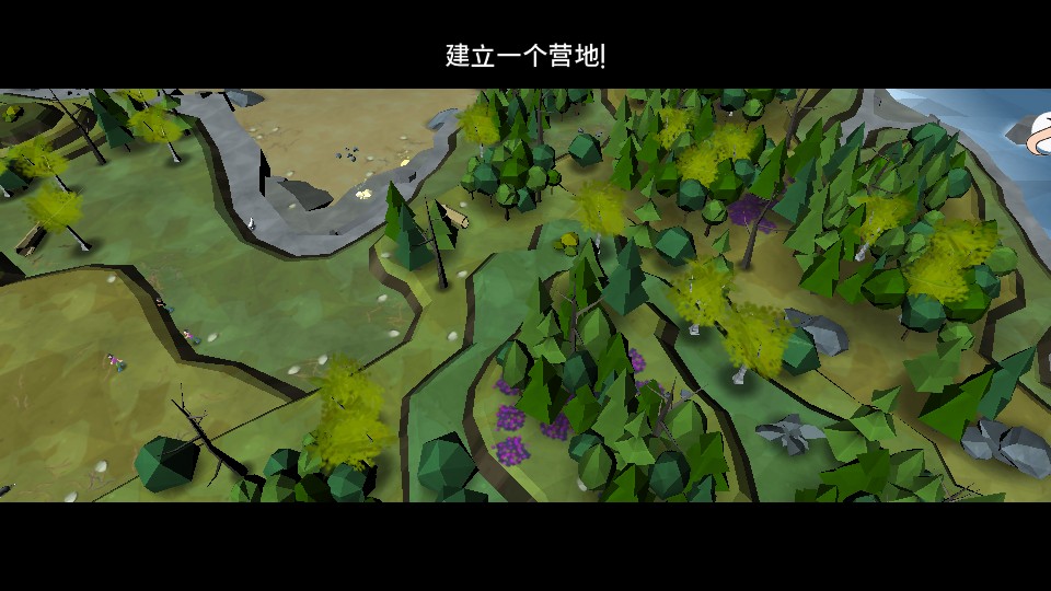 1、进入游戏后,看到【建立一个营地!】的提示,可在这片包含树林、地形的区域规划营地建设。
