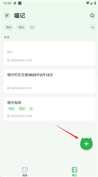 4、在喵记里可以查看到记录的笔记,也可以手动添加,如图所示