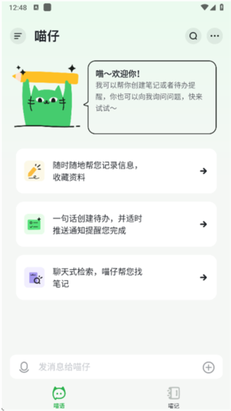 3、通过对话可以让喵仔帮你记录笔记,可以语音输入和传图片