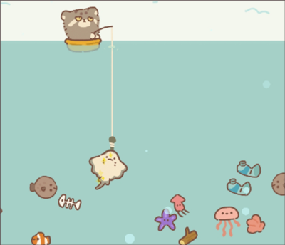 鱼塘18样物品:鱼骨、易拉罐、塑料瓶属于垃圾,树枝、小丑鱼、比目鱼、水母、鱿鱼、螃蟹、粉色贝壳、海星、红河豚、鲨鱼容易钓,海马、墨鱼、海胆、金鱼每天随机出现一种或者不出现,蝴蝶鱼出现时池塘水面有布灵布灵的光,像福袋一样闪闪发光。