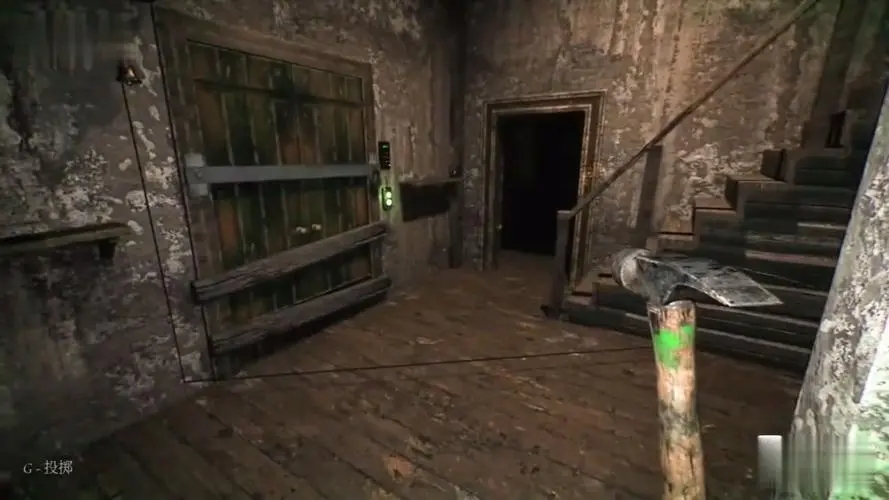下楼梯后左边的地板上有一根黑线,从上面走过铃铛会响,需要注意。楼梯旁的柜子里可以躲,柜子对面有一个门,里面可能刷东西。柜子旁边有一个门通向地下室(由于画面较暗