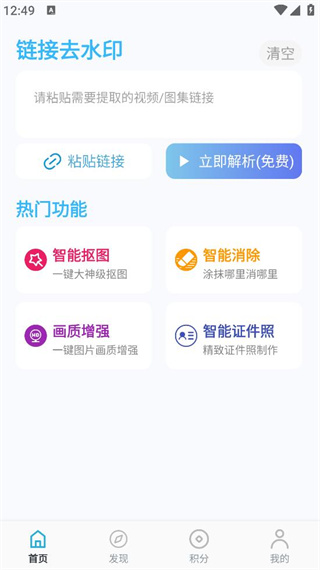 4、打开后即可进入功能丰富的操作界面,进行智能抠图、画质增强、和证件照的拍摄。