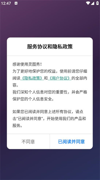 1、在你的手机上下载并安装灵图秀app,阅读服务协议点击同意。