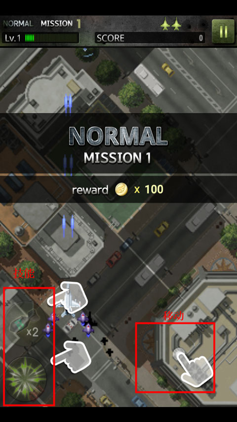 1、进入游戏,滑动屏幕可以移动飞机,左边有两个技能可以使用;