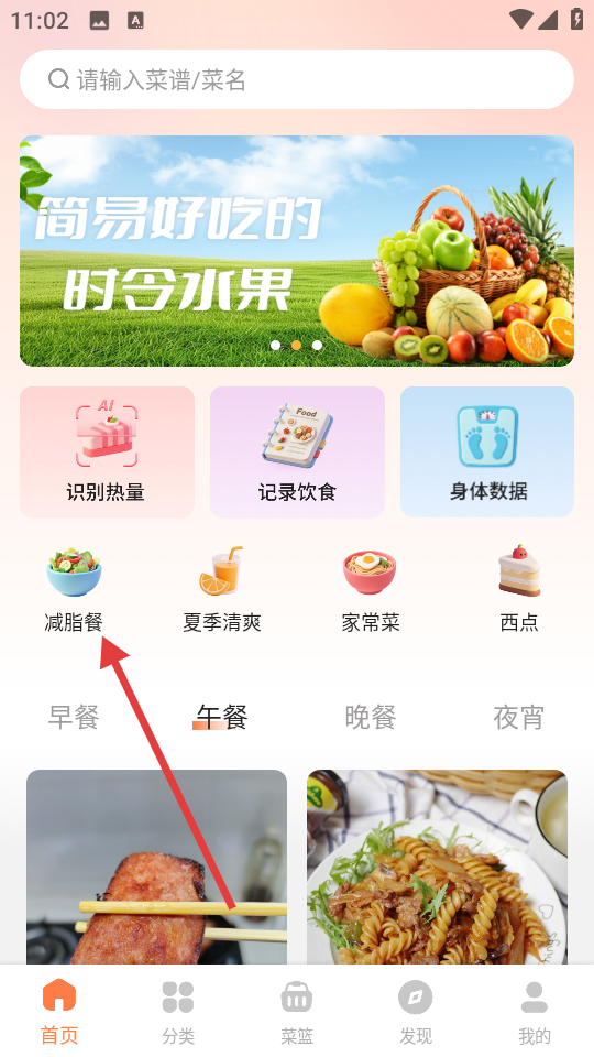 1、在懒人食谱首页,设有识别热量、记录饮食等实用工具,还有减脂餐、家常菜等分类入口,首先可以点击减脂餐能进入对应专栏,获取低卡的减脂菜品教程。