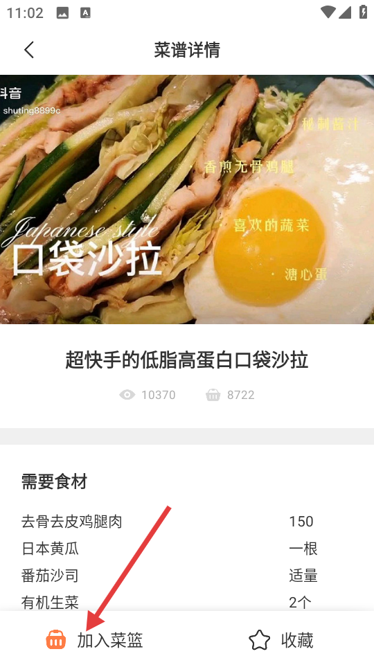 3、菜谱详情页展示菜品图、名称、浏览及收藏数,底部有加入菜篮和收藏按钮,用户点击加入菜篮按钮,即可将该菜谱食材添加至APP菜篮,方便用户集中采购。