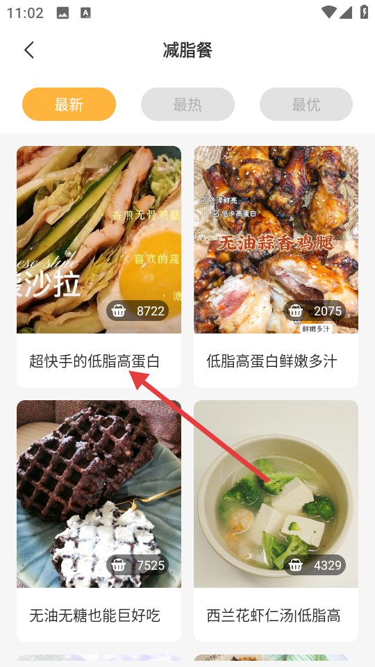 2、减脂餐板块界面顶部有最新、最热、最优分类标签,可切换筛选不同排序的减脂餐内容,点击喜欢的菜品进入烹饪教程页面,助力用户轻松做出适合减脂期的美味佳肴。