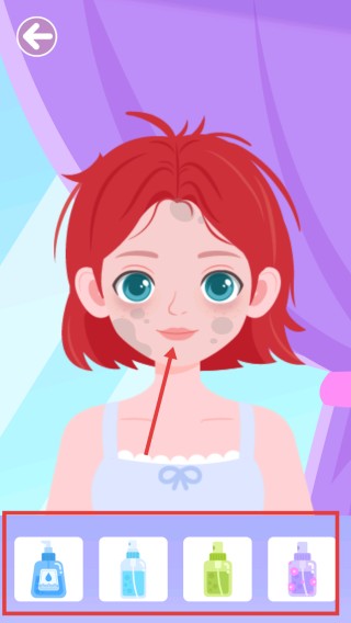2、进入清洁界面后,看到人物脸部有污渍,下方有不同清洁用品图标,选择合适的清洁用品对人物脸部进行清洁。