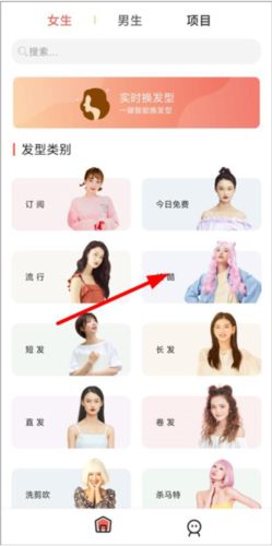 1、打开发型测试相机app,进入主页,点击想要拍照测试的发型;