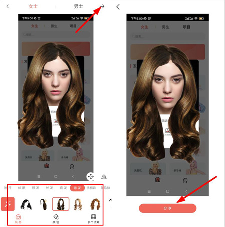 3、下方工具栏可以替换发型和颜色,选择合适的之后点击右上角即可保存,也可分享给好友。