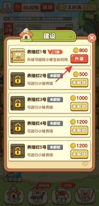 3、在【建设】界面,升级养殖栏(如养殖栏1号),解锁新栏位,提升养猪效率。