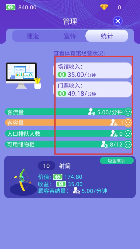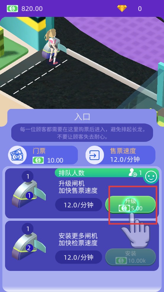 1、在入口区域,为避免顾客排长队失去耐心,点击“升级”按钮,花费5元升级闸机,加快售票速度。