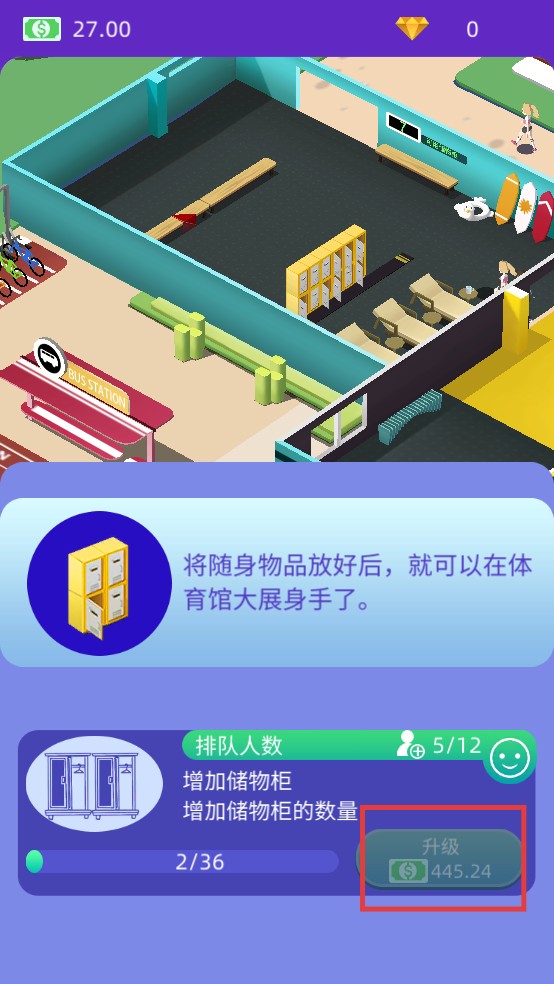 2、进入体育馆内,看到储物柜相关提示,为满足顾客存放随身物品的需求,点击“升级”按钮,增加储物柜数量。