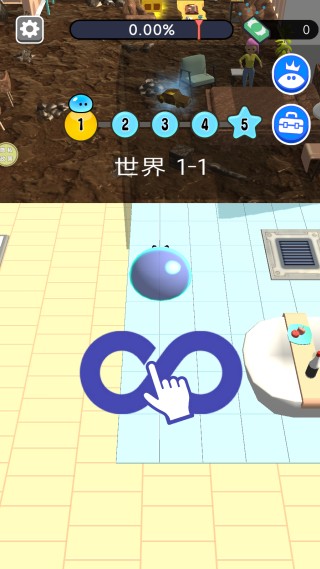 1、滑动屏幕操控史莱姆在城市中移动,经过污渍区域即可将其清除,完成区域清洁任务。