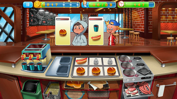 接下来是进入游戏画面,在下面图中你可以看到每名前来消费顾客的需求,针对不同的顾客你需要制作不同的美食来完成需求,从中获取的金币,可以在后续用来升级你的厨房,提升厨房厨具的工作效率,减少顾客的等待时长。