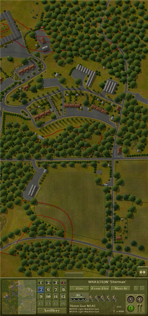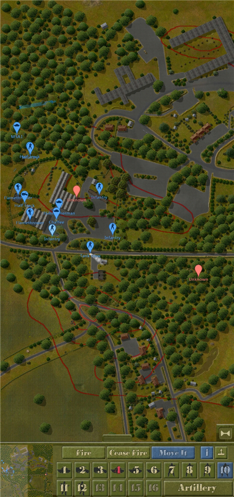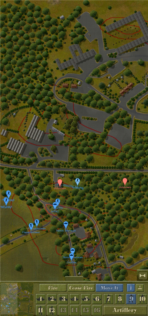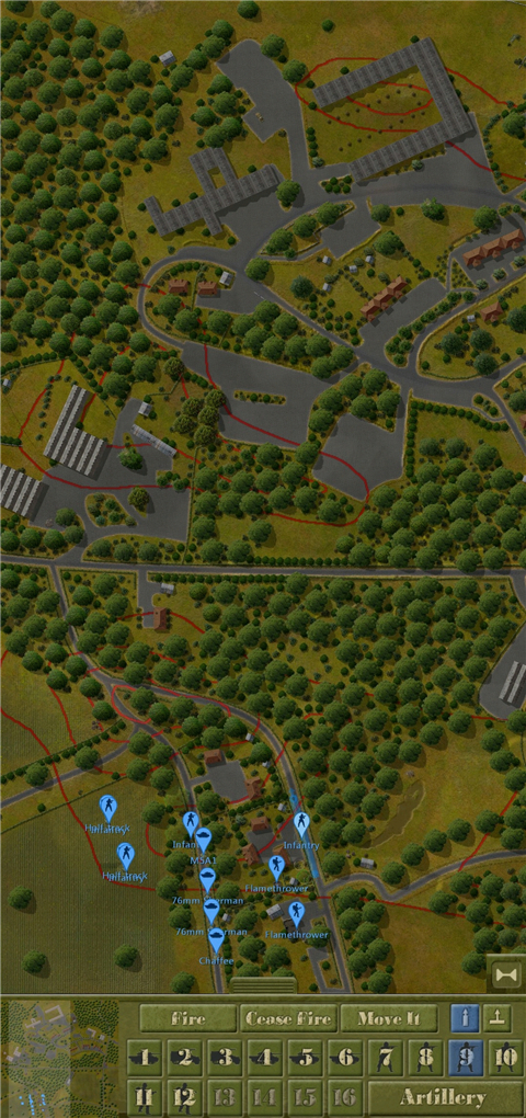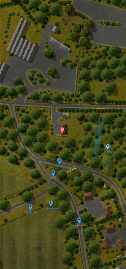 3、由图可见,这种情况非常危险。我方的余回部队被发现,但由于处于丛林复杂环境没有被交叉火力压制,我决定让他强行进攻,并派遣m5a1进行支援,地图最左端的机械步兵则进行大于回穿插,机械步兵团的位置被遮蔽物环绕,不用担心遭到火力打击。
