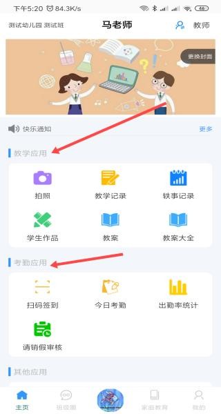 2、教学应用与考勤应用板块清晰,有拍照、扫码签到等功能,满足教学与考勤需求。