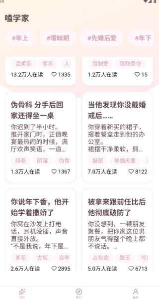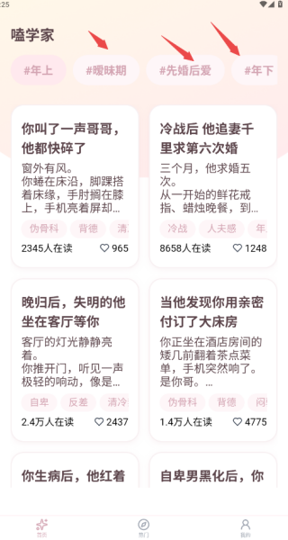 嗑学家这是一款专门面向女性读者们所打造的一款网文小说平台,在平台当中拥有相当丰富的女频小说资源等待我们去获取,每天都有新鲜剧情上线,关键全程免费,不用花一分钱就能畅读,各种各样的题材可供我们选择,无论你有着何等刁钻的口味,它都能满足你!