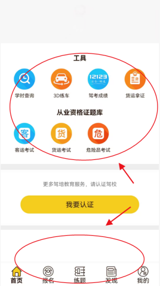 1、打开软件,进入到首页,提供工具,写实查询、3d练车、驾考成绩、货运拿证、客运考试等服务。