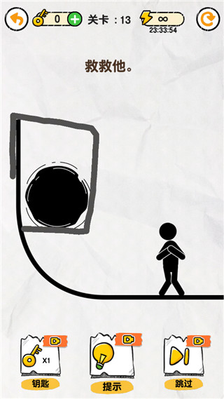 9、第29关(救救他):在大锤砸下来之前,画一个斜倒“V”,让大锤砸在线上。