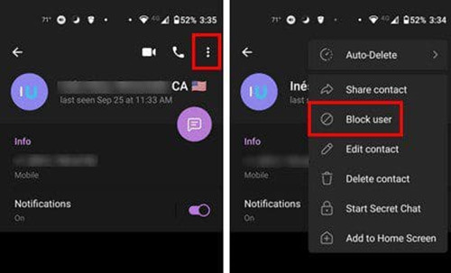 在 Telegram 上阻止某人的另一种方法是打开该人的联系人并点击顶部的他们的名字。当联系人打开时,点击右上角的点。Block user 选项将是倒数第三个选项。