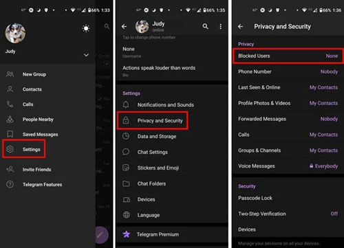 打开 Telegram 后,点击左上角的三行菜单,然后转到“设置”——点击“隐私和安全”,然后点击“阻止的用户”选项。