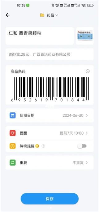 3、设置好提醒时间,点击保存,即可录入成功