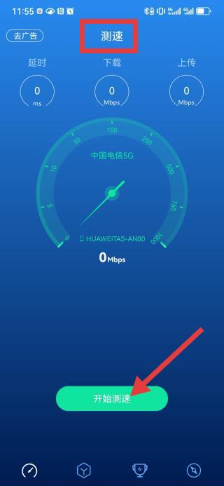 2、测速高手app的测速功能界面,中间显示网络、设备,及延时、下载、上传初始数据,底部开始测速按钮,用于启动网速检测,测试手机、下载和上传速率等。