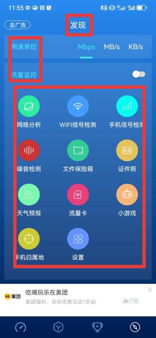 3、发现界面顶部有去广告、发现按钮、测速单位切换栏、流量监控开关,及网络分析、WiFi信号检测等功能入口,还有美团广告,汇聚测速外的实用工具与拓展服务。