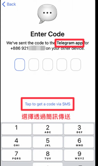 如下图,如果它显示的是「We've sent the code to theTelegram app」,那就代表Telegram 验证码是传送到「App」里面的聊天室里,这时候你可以点选底部的「Tap to get a code via SMS」,改成透过简讯传送验证码
