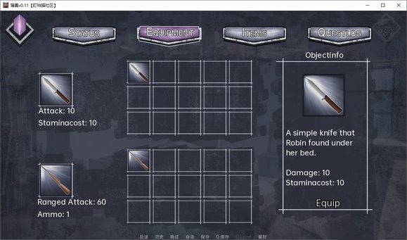Knife(小刀):近战武器,伤害 10,耐力消耗 10。获得:救了Robin后,在家里找武器。A simple knife thatRobin found underher bed(罗宾在她床下找到的一把简单的刀).