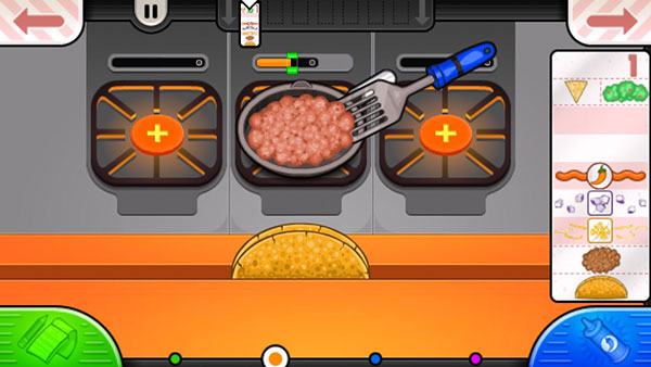 6、现在我们加热肉,在灶台上一个记时器,等时间到绿色的时候,拖动铲子来反动食材,等时间好了,拖动食材到饼里,然后点击蓝色按钮。