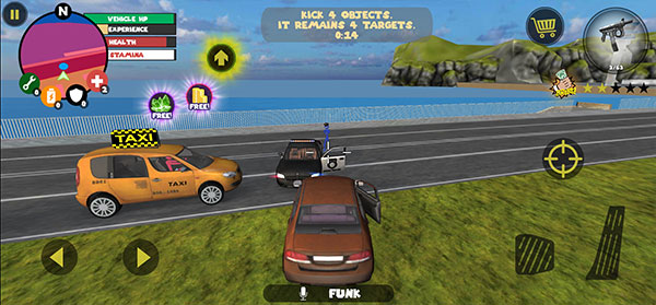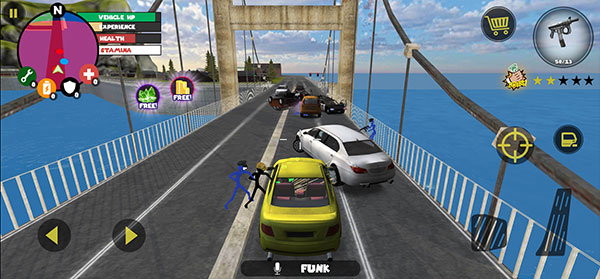 左侧移动、加速,右侧绳索,攻击(跳跃),跳跃,右上侧的武器更换以及血量、经验的显示都实时更新,一览无遗,凭借着大家自由的玩法,与其他帮派的人物进行交火,期间杀人能够获得经验,杀多了会产生星级,警察和其他附近角色会特殊照顾你对你展开火热的进攻,而如何存活,如何将其他人物击杀则是你所需要完成的任务。