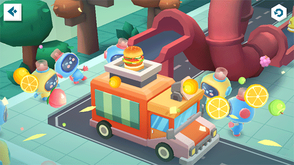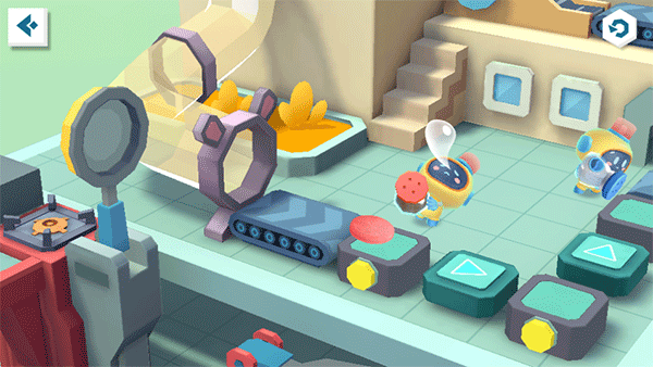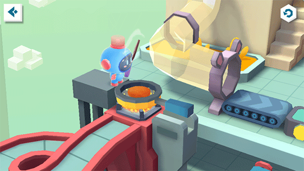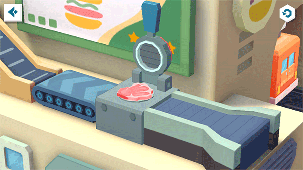 “砰”——生肉块进场,美食加工厂,开工咯!宝宝先按下压肉机,给生肉块换个“新造型”。瞧,煎锅处的机器人已等候多时,宝宝快使用锅铲弹弓,瞄准煎锅,发射生肉块!听,肉块在锅中滋滋作响,待其变熟即可前往下个地点。