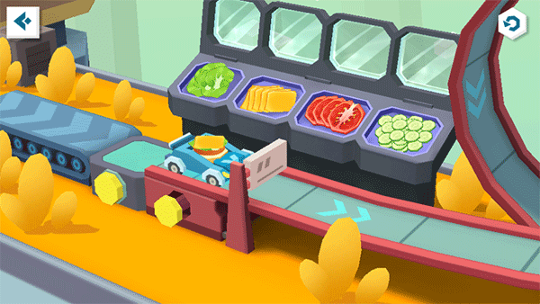 芝士、西红柿……熟透的肉块和哪些配料更搭?宝宝来选一选。添加完毕,出发酱料区:奶油沙拉酱、蜂蜜芥末酱……丰富酱料,宝宝随心添加。只差最后一步了!宝宝快启动弹跳格,让汉堡通过趣味弹球桌,与面包盖“会合”,yes!美味汉堡大功告成。
