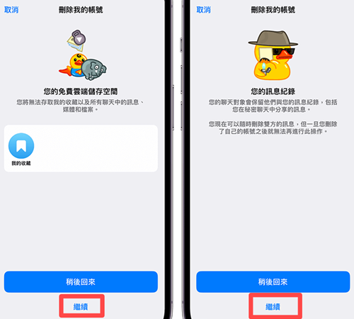 这边系统会提醒你,删除 TG 帐号后,你将无法继续存取收藏以及所有聊天讯息、媒体和档案,请点选「继续」。